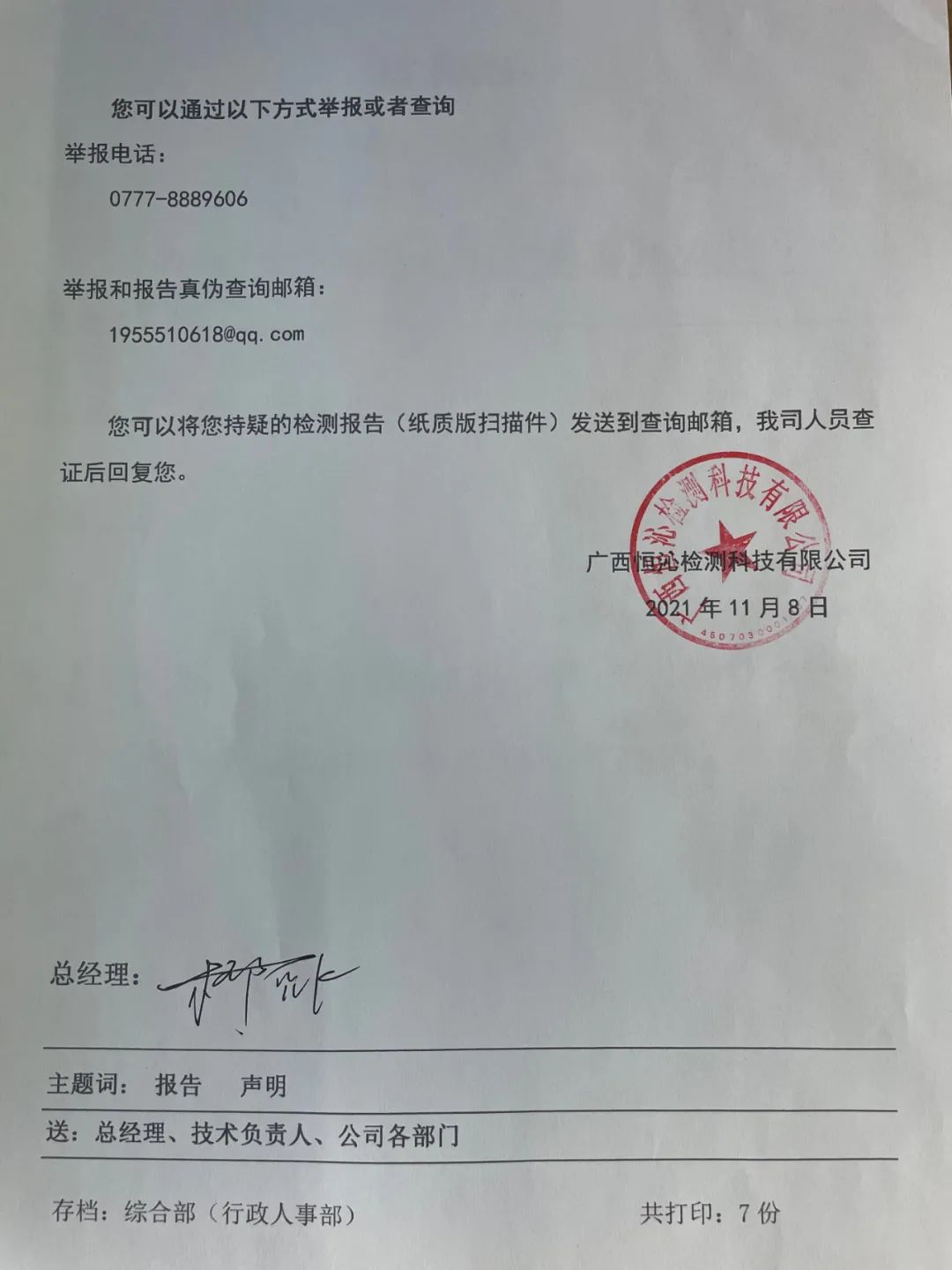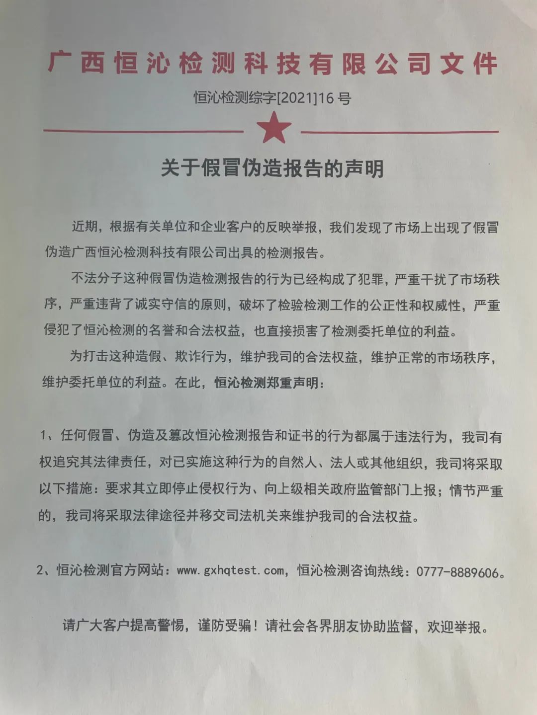 關(guān)于假冒偽造廣西恒沁檢測科技有限公司報告的聲明